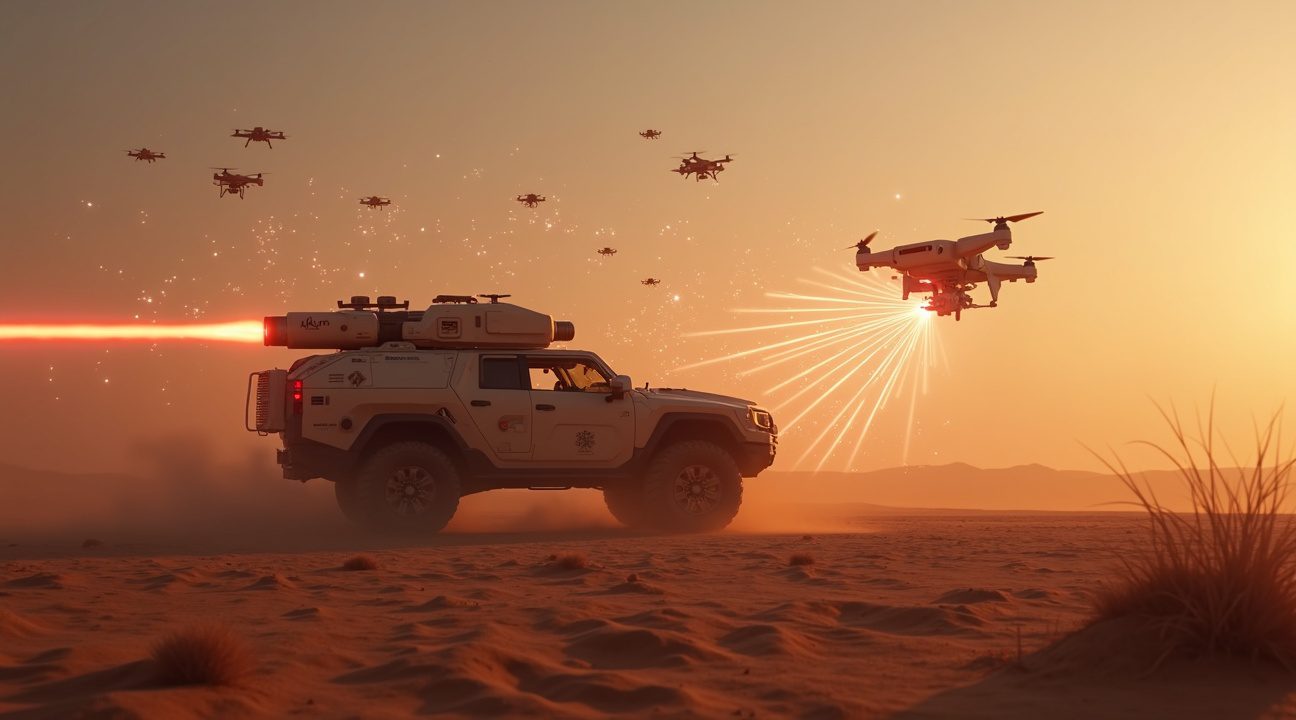 • Dual-layer defense system combining electromagnetic jamming for soft-kill tactics with high-energy laser weapons capable of hard-kill destruction of drones up to one mile away