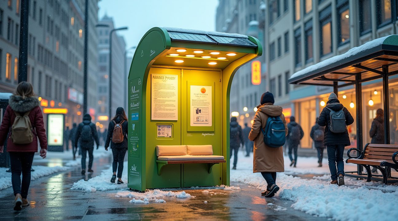 The heated seating provides immediate comfort for users seeking refuge from harsh weather conditions. USB charging ports address a critical modern necessity, allowing people to power their smartphones and other essential devices. Free Wi-Fi access ensures users can maintain vital connections to information networks and digital services.