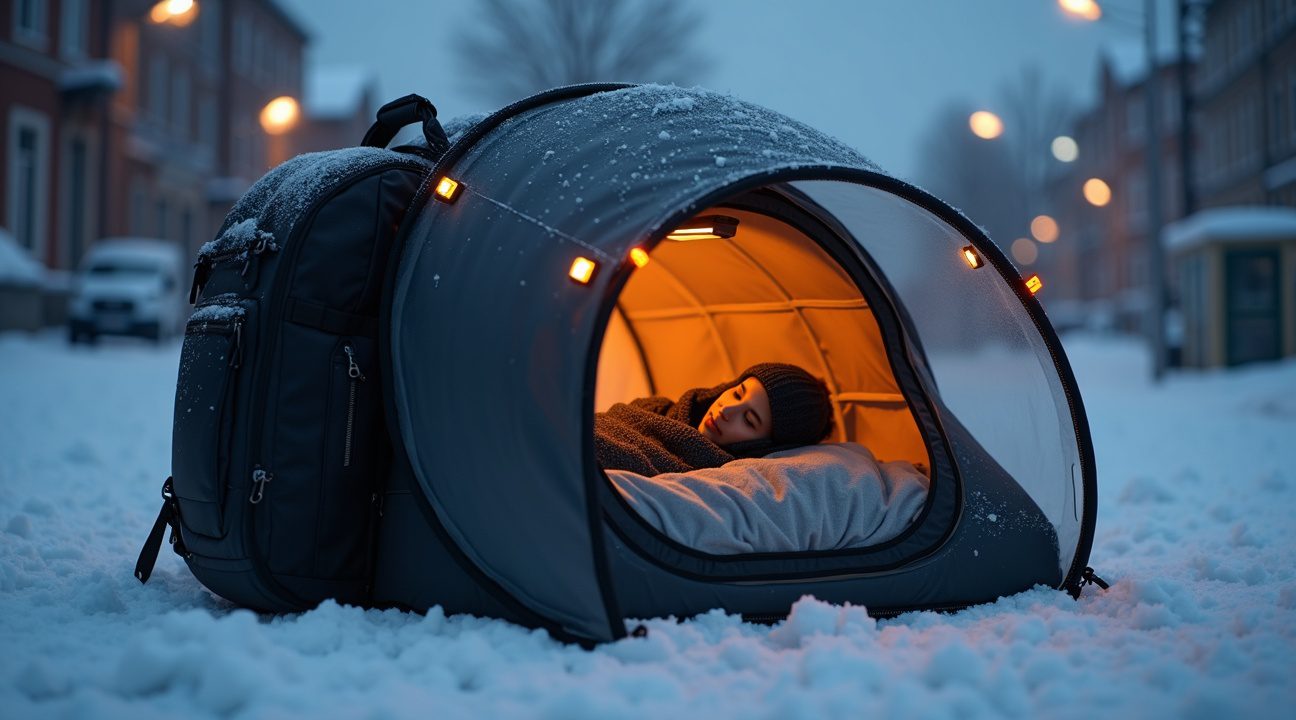 When unfolded, the backpack reveals an insulated sleeping space engineered to withstand harsh weather conditions. The weather-resistant design incorporates waterproof materials and thermal insulation that maintain warmth even in freezing temperatures. This German innovation addresses critical survival needs while preserving the user’s dignity through thoughtful design choices that avoid stigmatization.