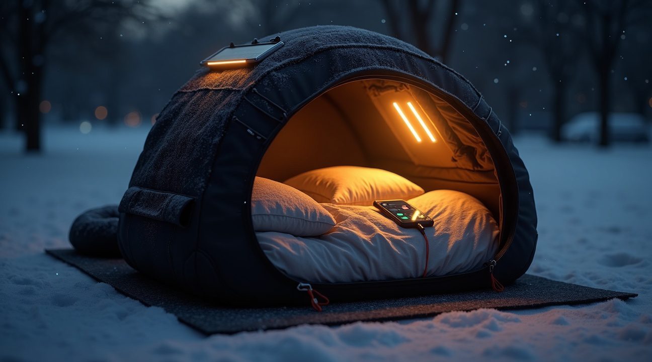 - The backpack unfolds into a fully insulated, weatherproof sleeping space with integrated solar panels that power LED lighting, device charging, and heating elements throughout the night.
