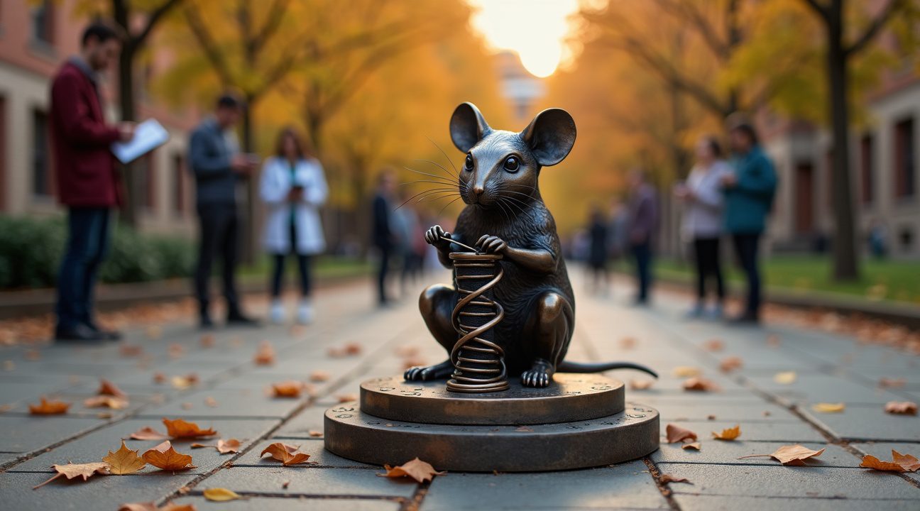 The glasses worn by the bronze mouse serve multiple symbolic purposes, suggesting both the intelligence required for scientific work and the careful observation that characterizes quality research. This design choice elevates the laboratory mouse from mere test subject to collaborative partner in the pursuit of knowledge. The mouse’s posture conveys concentration and purpose, emphasizing that scientific progress requires dedication from both researchers and their animal subjects.