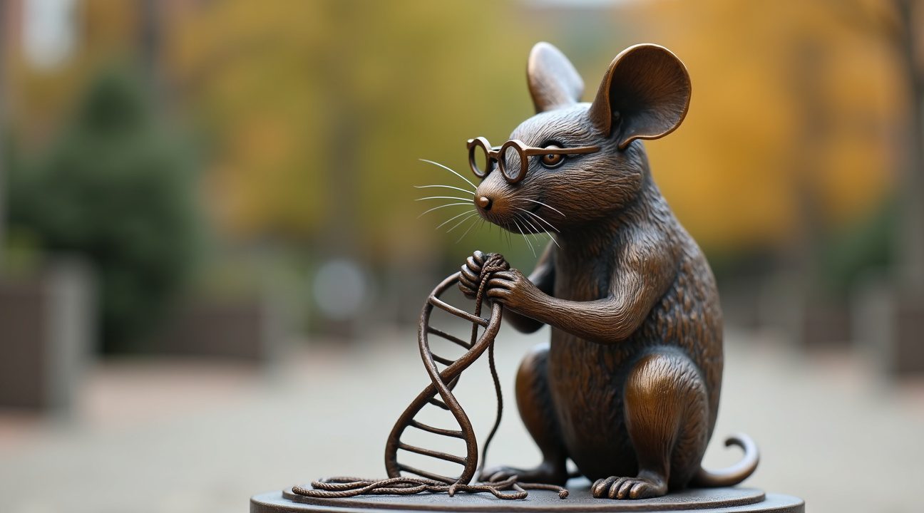 - The monument depicts a mouse wearing glasses and knitting a DNA double helix, symbolizing the careful construction of scientific knowledge through systematic experimentation.
