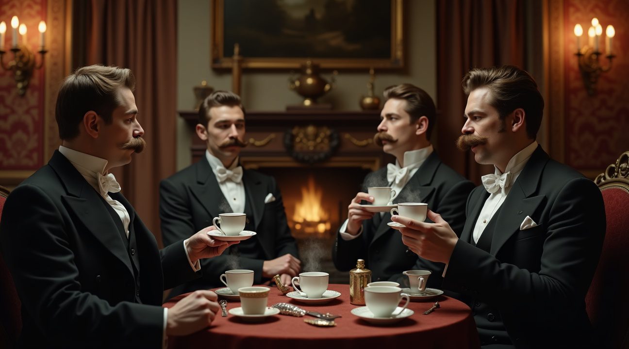 Tea etiquette during this period demanded that gentlemen maintain their carefully cultivated appearance even during social gatherings. Entertainment culture of the time reinforced these standards, making facial hair maintenance a visible marker of Victorian masculinity and social refinement.